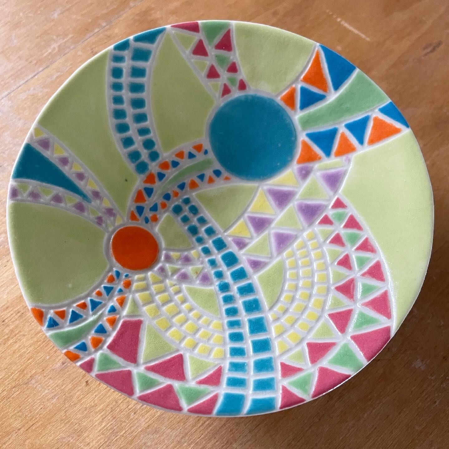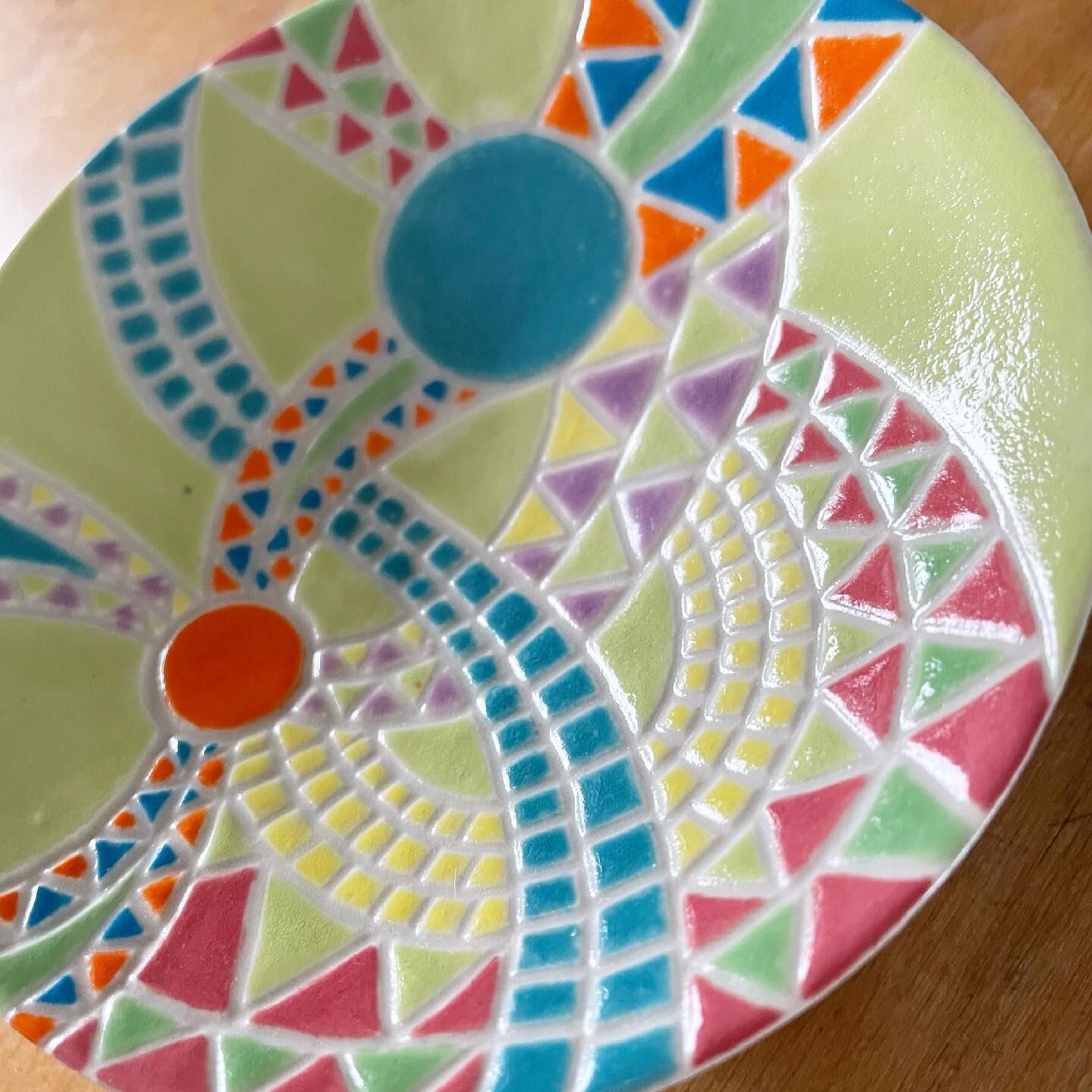 半磁気土を手捻りで成型後、彫り込んで素焼きをし、カラフルな釉薬をかけて1200℃で焼成しました。